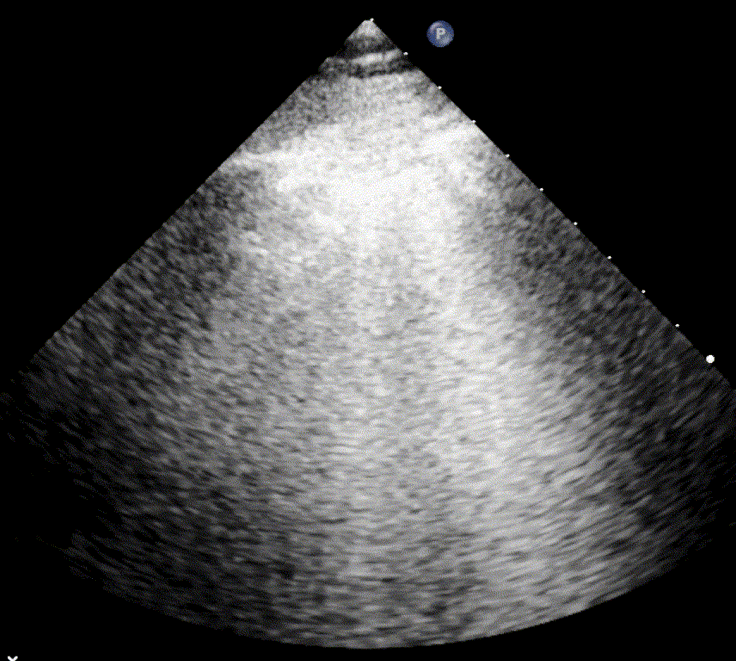 In healthy, air-filled lungs, the ultrasound image appears gray. This occurs because air scatters sound waves as they encounter solid interfaces such as the pleura, resulting in a diffuse, speckled gray appearance beneath it. Within normal lung parenchyma, there is minimal acoustic impedance mismatch to reflect the ultrasound beam; instead, the beam is absorbed by air within the alveoli. Consequently, in a normal lung ultrasound, the parenchymal texture is not visualized. The only visible structure is the pleural line — a bright, horizontal echo that moves synchronously with respiration.